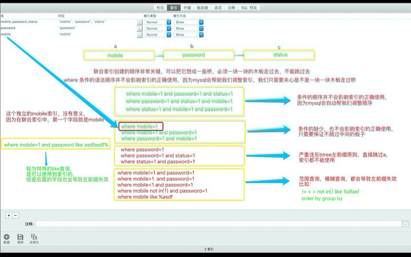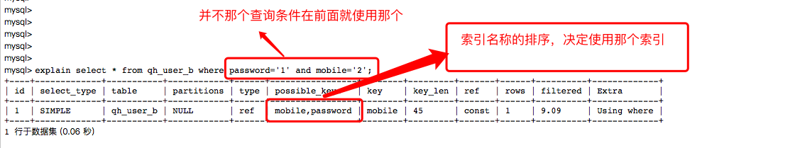 - where mobile=1 and password=12 如果分别建立了两个独立索引,mobile和password,只有一个用到索引,系统根据索引名的排序来决定使用那一个